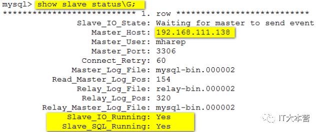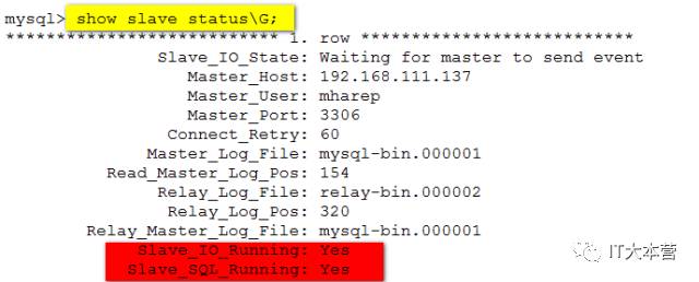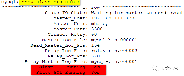 查看从的状态,以下红色部分必须为yes,代表从服务器能正常连接主服务器