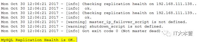 可以看到 master 的 IP 现在为 192.168.111.138, 已经切换到和192.168.111.138同步了,本来是和192.168.111.137同步的,说明 MHA 已经把Candicate master(centos3) 提升为了新的 master,IO线程和SQL线程也正确运行,MHA 搭建成功