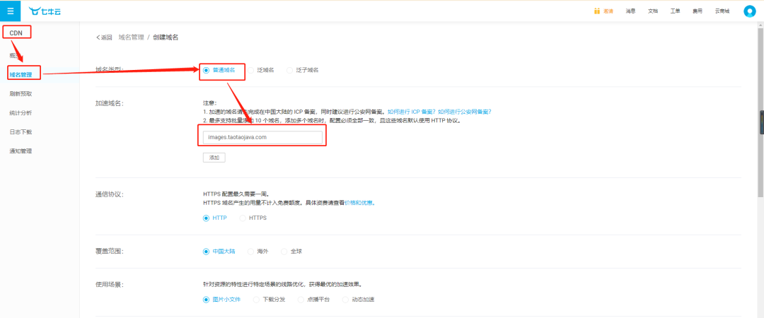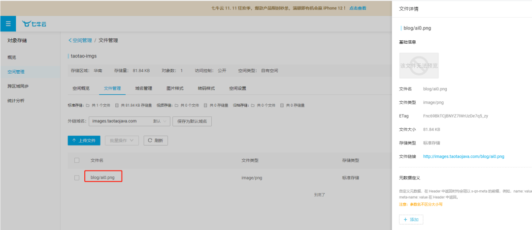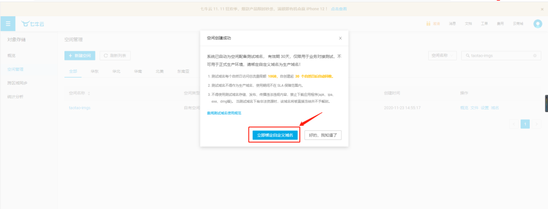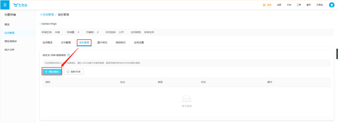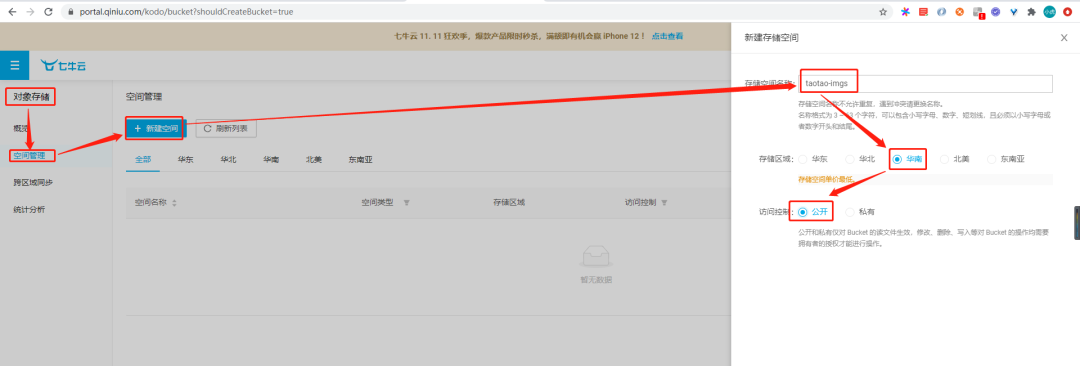 1、新建图床:对象存储->空间管理-> 新建空间;按要求填写存储空间名,选择区域