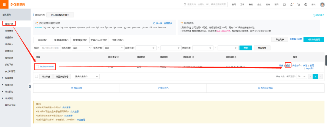 1、在域名列表,找到要配置的主域名,点击解析,添加二级域名