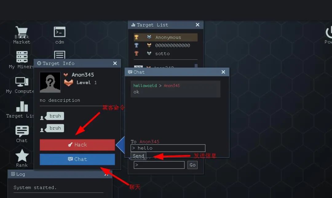 这个时候你可以选择发送下消息调侃下机器人,然后我们要输入黑客命令,选择Hack,然后选择端口,如图: