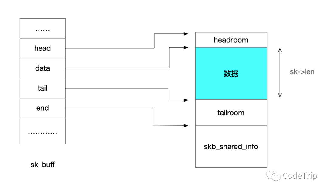 end: 指向skb_shared_info结构的开始(即。数据包数据存储区域之外的第一个字节。)它也被设置在缓冲区分配时间,此后从不调整。