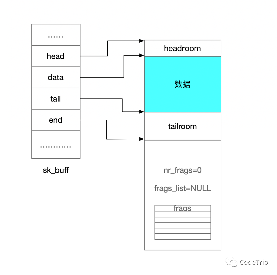 frags[]: frags数组保留指向碎片化subuff的页面结构的指针。最后使用的页面指针是nr_frags-1,有最多为MAX_SKB_FRAGS的空间。