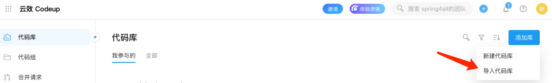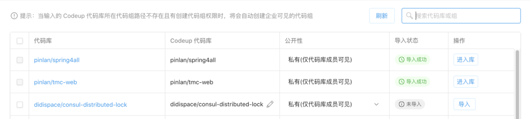 在完成认证信息配置好之后,Codeup就会从对应的平台获取所有项目仓库,接下来只需要逐个选择你要导入的仓库点击“导入”按钮,就能轻松完成代码的迁移。