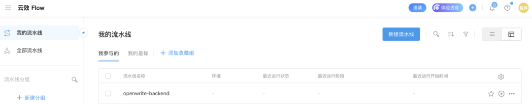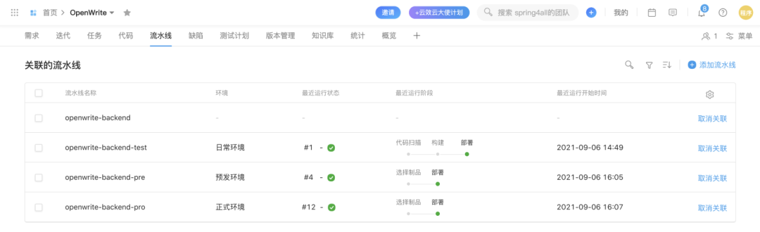 同时,作为管理门户,对于之前介绍的云效Codeup、云效Flow自然也可以联系起来。只需要通过点击菜单中的代码、流水线(刚创建的时候,需要点击关联选择同账号下配置的代码仓库和流水线),就能进行查看和实现日常操作!