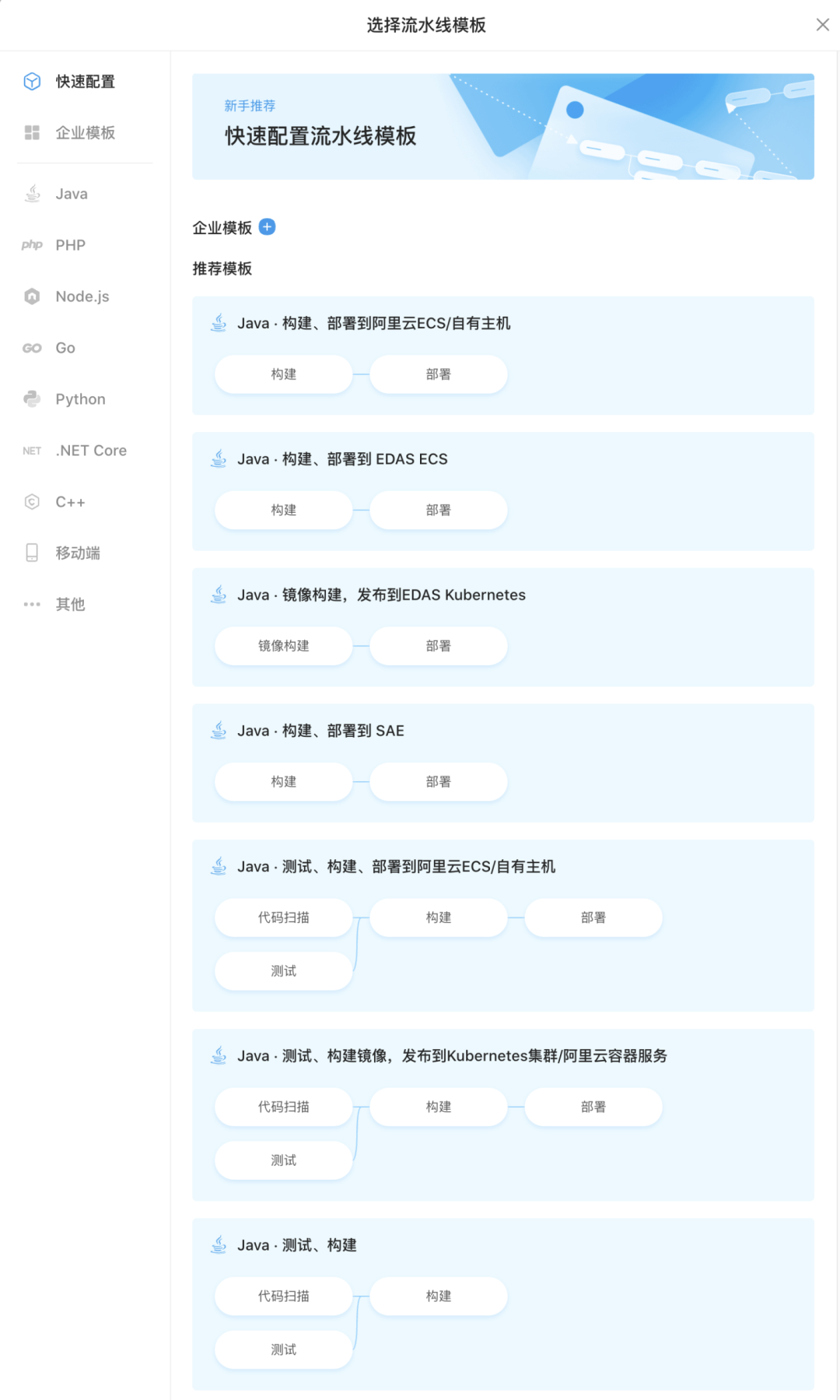 在云效Flow中创建CI/CD的流水线非常简单,因为它提供了各个主流开发语言的多种持续集成案例的配置模版。