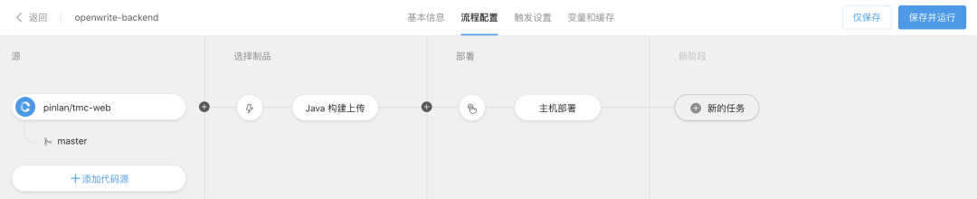 这里我尝试了配置一个Spring Boot后端应用部署到ECS上,只需要选择上图中的第一个推荐模版。就会出现如下图的流水线配置界面,点击每个步骤都可以进行细节配置