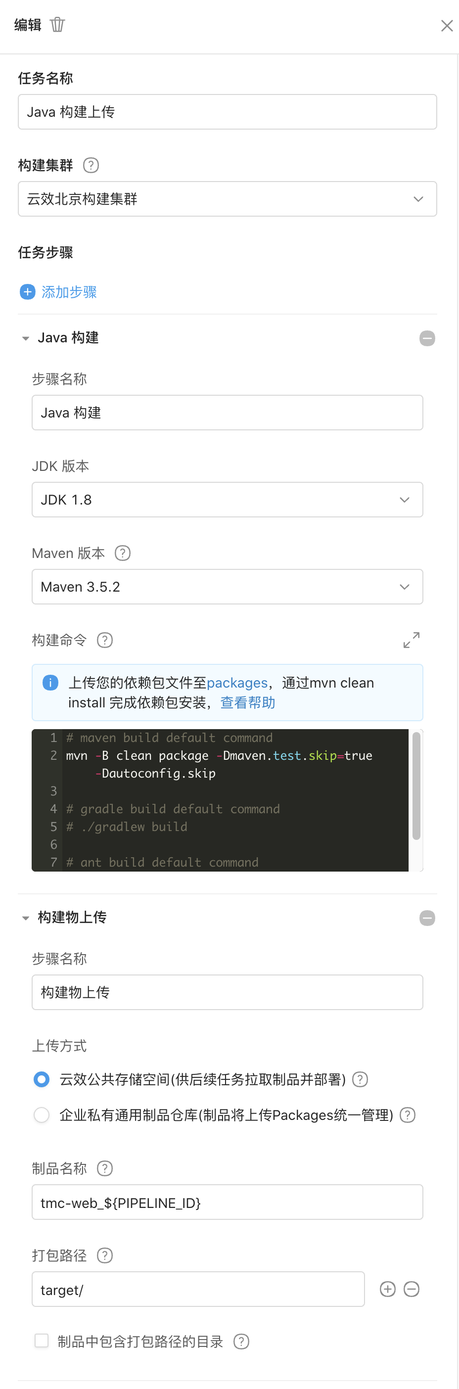 点击每个步骤都可以进行细节配置,比如:如何用maven命令构建,如何上传制品
