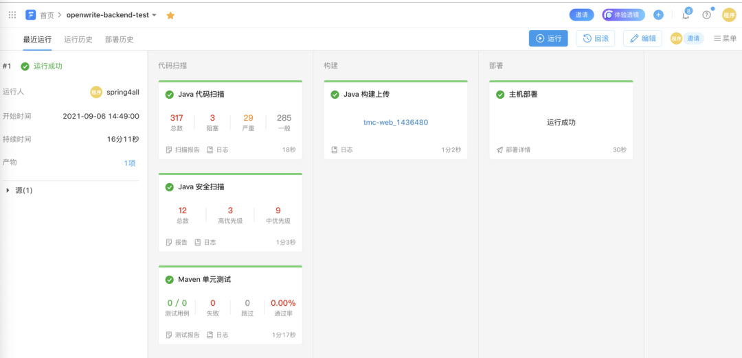 这里值得一提的是,在云效Flow中所提供的各种操作模版是非常适应于我们国内用户的,比如:可以看看我在test环境的流程细节,这里增加了代码扫描,里面就涵盖了阿里巴巴代码规约的检查报告等。