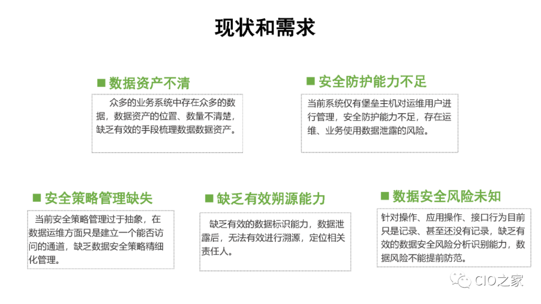 大数据DT时代,数据应用场景和参与主体的日益多样化,数据安全体系建设必须抛弃传统的单点防御模式,而要采用全局治理的体系化建设思路。