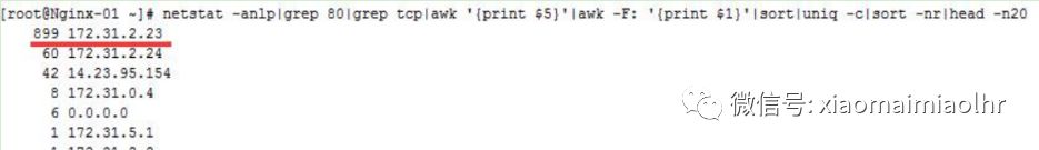 1netstat -anlp|grep 80|grep tcp|awk '{print $5}'|awk -F: '{print $1}'|sort|uniq -c|sort -nr|head -n20