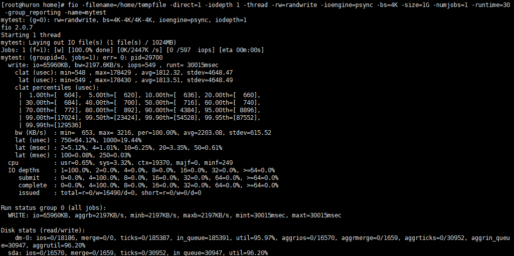 fio -filename=/home/tempfile -direct=1 -iodepth 1 -thread -rw=randwrite -ioengine=psync -bs=4K -size=1G -numjobs=1 -runtime=30 -group_reporting -name=mytest