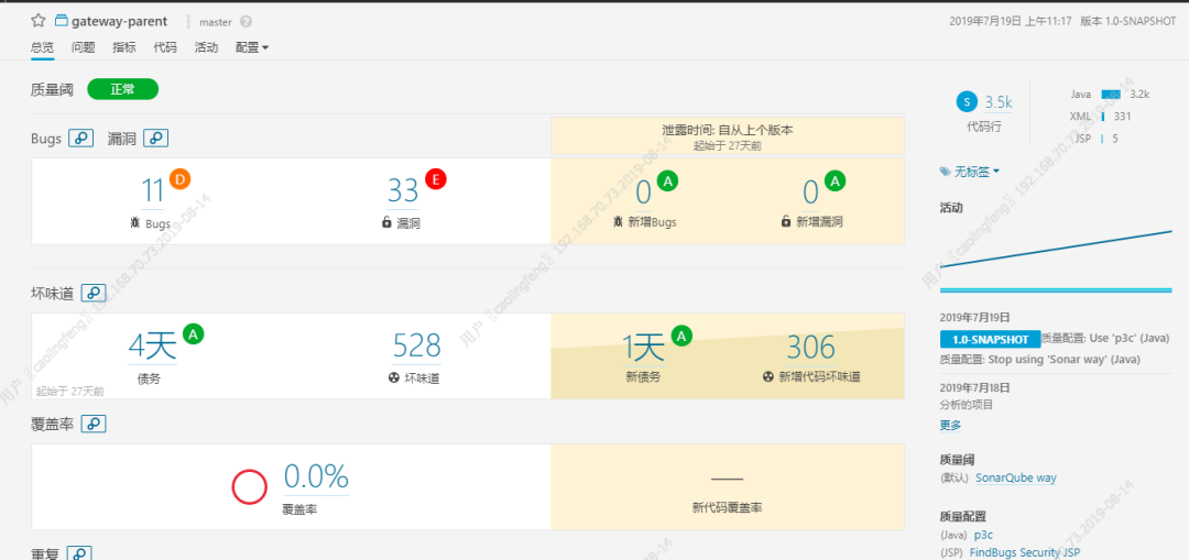 2、项目总面板视图。显示项目包括程序统计信息、问题统计信息、技术债务、代码复杂度、单元测试覆盖度等。