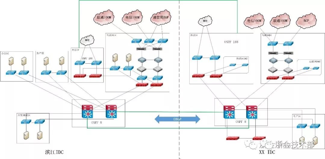 · 两个数据中心汇聚层通过三层IP链路互联,分别为不同的AS自治区,AS内部运行OSPF,AS之间运行BGP,将路由变化的影响隔离在一个数据中心之内。AS之间互联物理接口建立EBGP邻居关系,AS内部两台核心交换机通过loopback接口建立iBGP邻居关系。