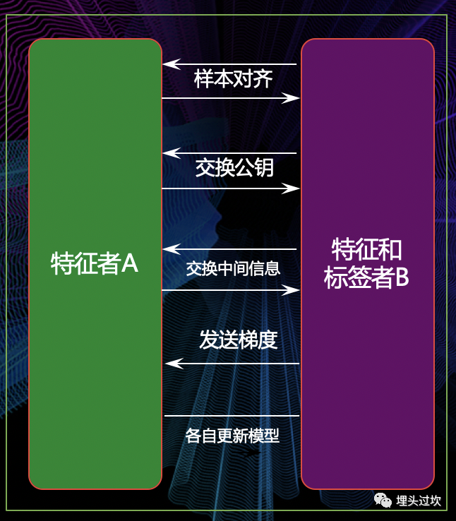 这是个两方参与的场景, 其中B是带特征和标签的, 训练的主要步骤为: