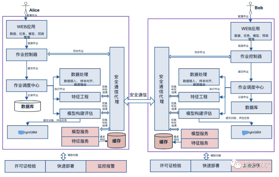 这个架构主要实现两方的纵向联邦学习。 参与方为Alice/Bob, 采用DAG调度框架, 用户通过网页进行数据上传、管理、 作业配置、触发、查看,模型评估、及发起预测等等操作。 主要分为模型构建及模型推理两大部分, 其中模型构建又包括数据处理(数据导入、数据对齐、数据融合等操作)、特征工程及模型的构建和评估, 模型推理包括模型serving及在线特征服务。 公共的模块包括作业控制器,用来组装作业,然后提交给作业调度中心的, 两方之间的安全通信是通过安全通信代理模块来完成的。 下面的支撑模块主要是产品进行私有化部署实施所需要的, 主要包括许可证检验、自动化部署及自动化监控报警运维模块。
