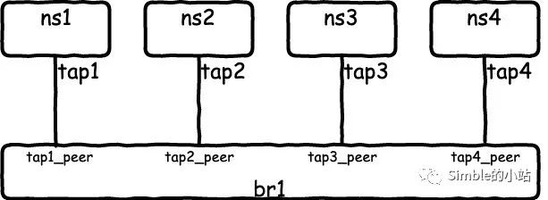 $ ip netns add ns1 $ ip netns add ns2 $ ip netns add ns3 $ ip netns add ns4 # 迁移tap接口 $ ip link set tap1 netns ns1 $ ip link set tap2 netns ns2 $ ip link set tap3 netns ns3 $ ip link set tap4 netns ns4