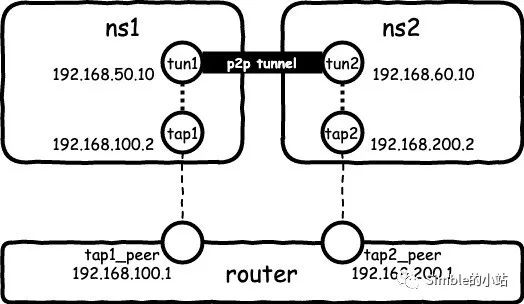 $ ip netns exec ns2 ip tunnel add tun2 mode ipip remote 192.168.100.2 local 192.168.200.2 ttl 255 $ ip netns exec ns2 ip addr add 192.168.60.10 peer 192.168.50.10 dev tun2 $ ip netns exec ns2 ifconfig tun2 up $ ip netns exec ns2 ifconfig tap2 Link encap:Ethernet HWaddr aa:2e:e9:18:94:95 inet addr:192.168.200.2 Bcast:192.168.200.255 Mask:255.255.255.0 inet6 addr: fe80::a82e:e9ff:fe18:9495/64 Scope:Link UP BROADCAST RUNNING MULTICAST MTU:1500 Metric:1 RX packets:12 errors:0 dropped:0 overruns:0 frame:0 TX packets:12 errors:0 dropped:0 overruns:0 carrier:0 collisions:0 txqueuelen:1000 RX bytes:928 (928.0 B) TX bytes:928 (928.0 B)