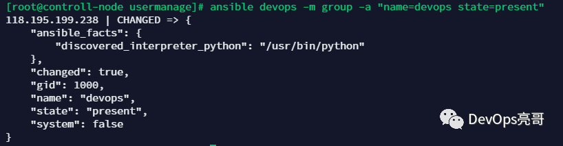 $ ansible devops -m group -a "name=devops state=present"