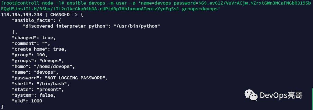 $ ansible devops -m user -a 'name=devops password=$6$.evG1Z/VuVrACjw.$ZrxtGWn3NCaFNGbR3195bEQgU5insiI1.H/0Sho/iIl2o1kcGka04bDA.rUPtd0pIHhfxnunAIeotzYynEqSs1 groups=devops'