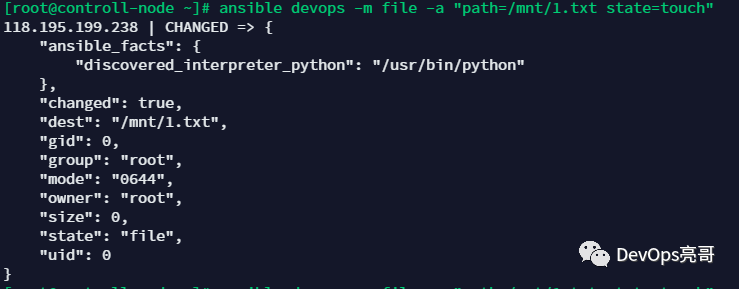 $ ansible devops -m file -a "path=/mnt/1.txt state=touch"