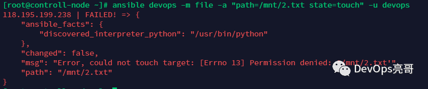 $ ansible devops -m file -a "path=/mnt/2.txt state=touch" -u devops