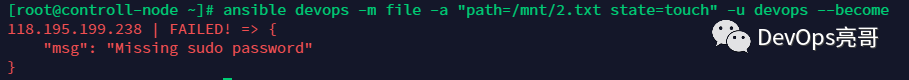$ ansible devops -m file -a "path=/mnt/2.txt state=touch" -u devops --become