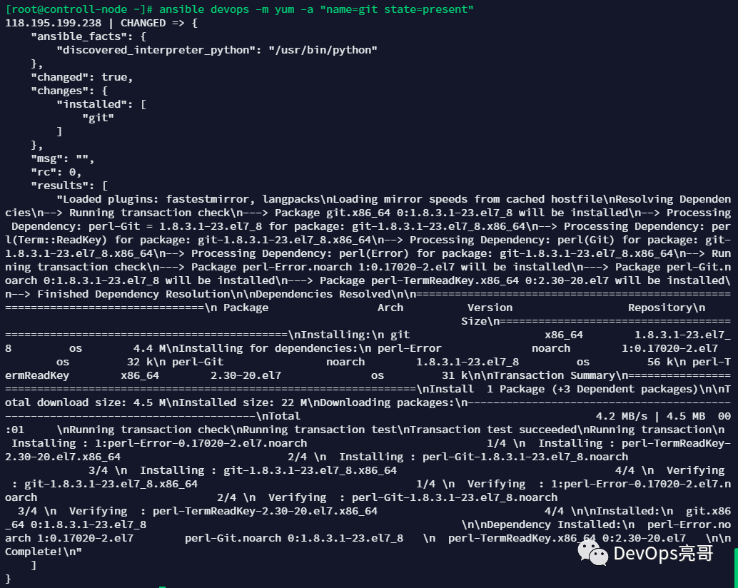 $ ansible devops -m yum -a "name=git state=present"