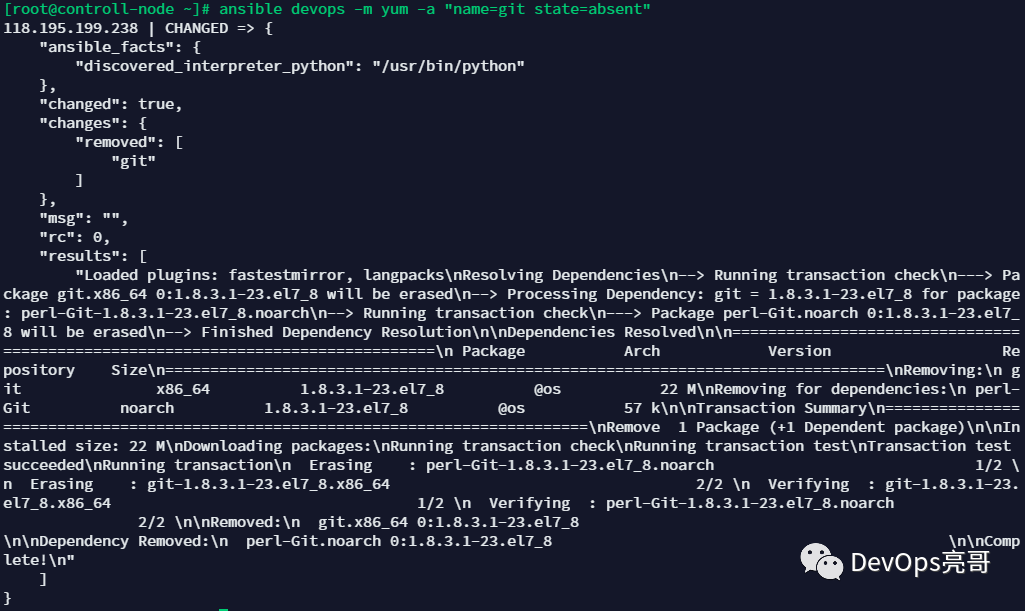 $ ansible devops -m yum -a "name=git state=absent"