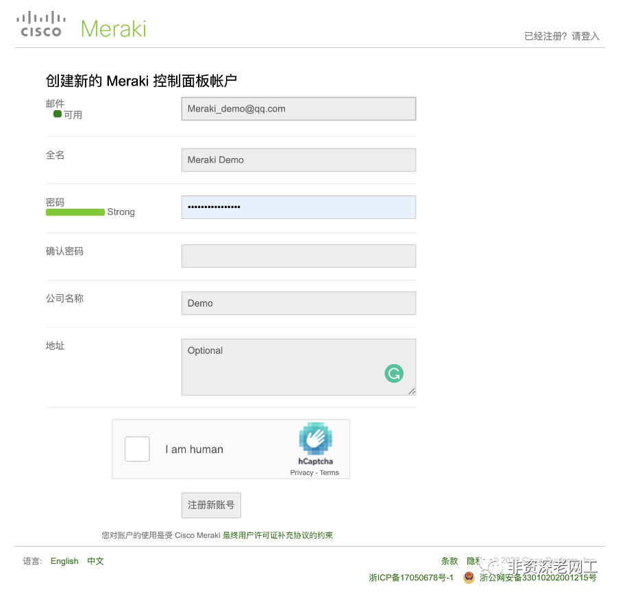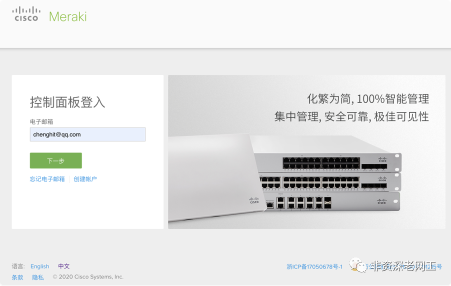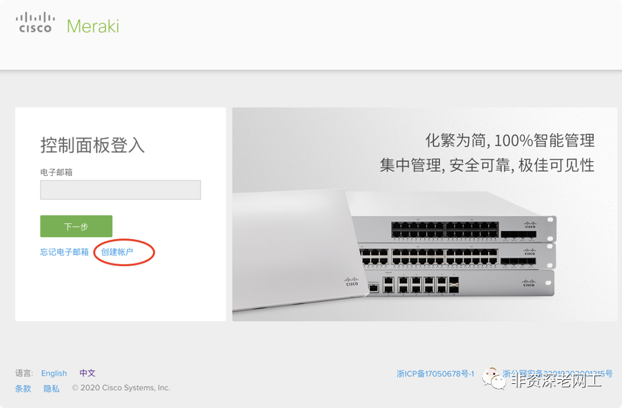 中国区Meraki账号需要在 dashboard.meraki.cn 网站上创建。注意域名后缀是 .cn,不是 .com
