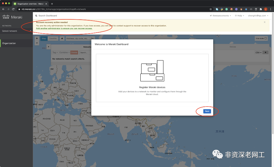 然后就会看到下面的初始化页面,提示注册Meraki设备。同时,系统也会提示,您当前是唯一的管理员。建议再添加其他的管理员,免得邮箱失效,密码丢失,就无法访问Meraki Dashboard,到时候就只能开Case解决。比如员工离职了,邮箱被公司注销,就可能导致失去对Dashboard的访问。