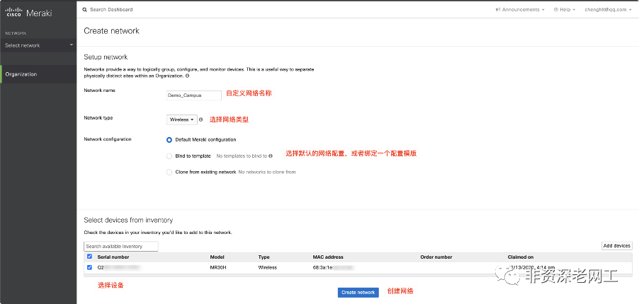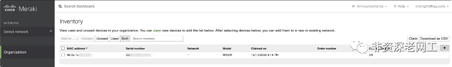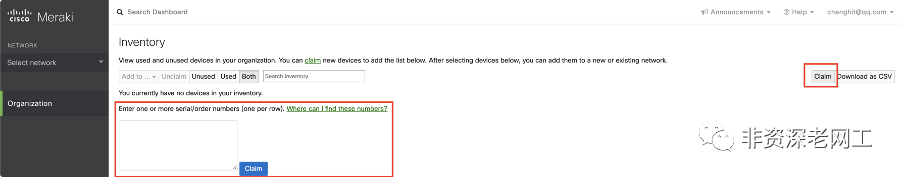 注册账号之后,回到dashboard.meraki.cn 或者 account.meraki.cn,登记设备序列号。