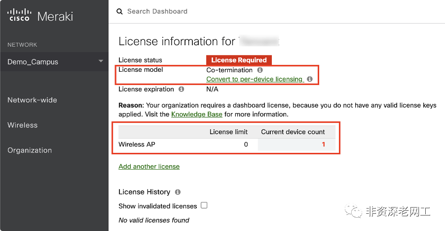 实际上,co-termination license 也有30 天宽限期,新注册一个 Meraki cloud 账号就可以得到30 天的试用。如果需要延长试用期限,需要联系 Meraki 的 Sales/SE 申请 Trial license。申请成功之后会得到一个 SN。
