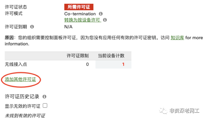 点击红色按钮,进入 License 页面查看详情,可以看到告警的原因是,当前组织没有Dashboard license,可用设备数量为0,但实际设备数量为1。