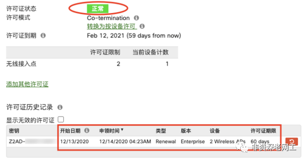 添加成功之后,就可以看到许可证状态变成了绿色的“正常”,并且在下方的许可证历史记录可以看到许可证包含的设备类型和数量,以及许可证期限。