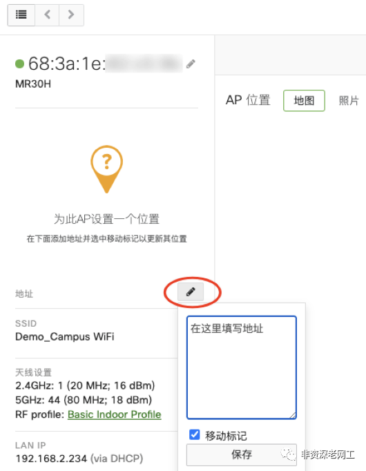 点击上图绿色的AP MAC地址,进入AP的详情页。在左边信息栏,填写AP的安装地址。然后就可以在Dashboard的地图上显示出来。中国区Meraki Cloud采用百度地图的API。