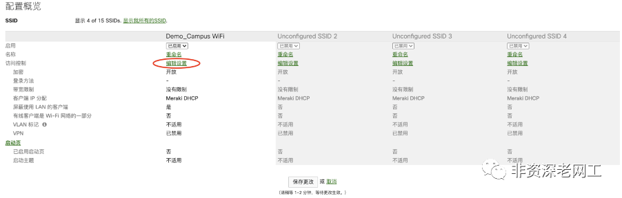 如果点击“重命名”,可以修改SSID的名称。其他所有的SSID设置,都需要点击“编辑设置”。或者,也可以在上面的菜单点击“访问控制”,或者其他配置选项,进入相应的配置页面。