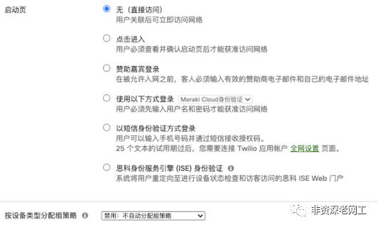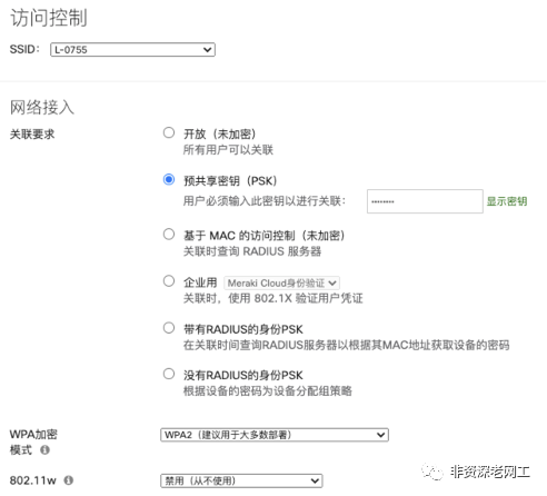 Meraki支持多种认证方式,包括PSK,802.1X,MAC by pass,Portal,短信等等。