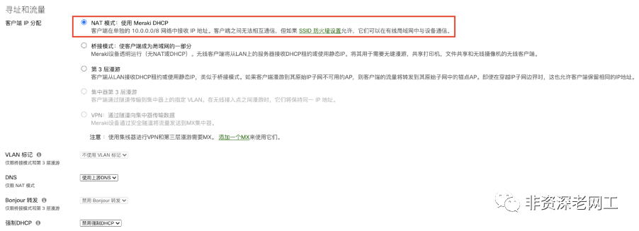 注意⚠️:Meraki MR 无线AP 在 NAT模式下,无线客户端隔离是默认开启且无法被关闭的。如果需要无线客户端能够在局域网直接通信,需要选择 Z3 SD-WAN网关。