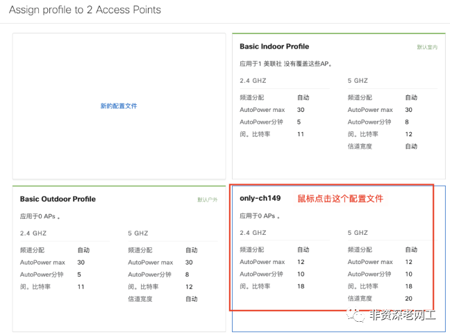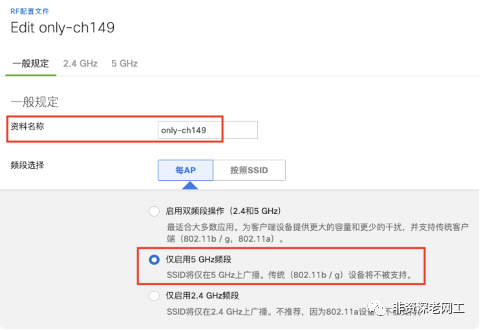 下面的设置,将会新建一个仅提供5GHz频段,信道149@20MHz,发射功率适中,忽略较弱的客户端(RX-SOP),不支持802.11b的RF配置文件。