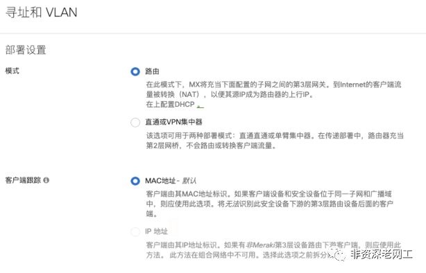 这里需要注意,如果希望在Dashboard里面根据客户端的IP地址来进行监控管理,则不能将MX路由器和MR无线AP放到相同的“Network”。必须将MX/Z路由器放入单独的一个网络,才能选择“IP地址”客户端跟踪模式。