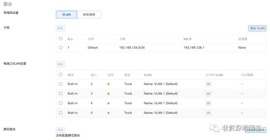可以为MX/Z路由器配置多个VLAN。默认情况下,4个千兆LAN口都是开启的,并且是Trunk mode,Native VLAN Id=1,permit VLAN=all。
