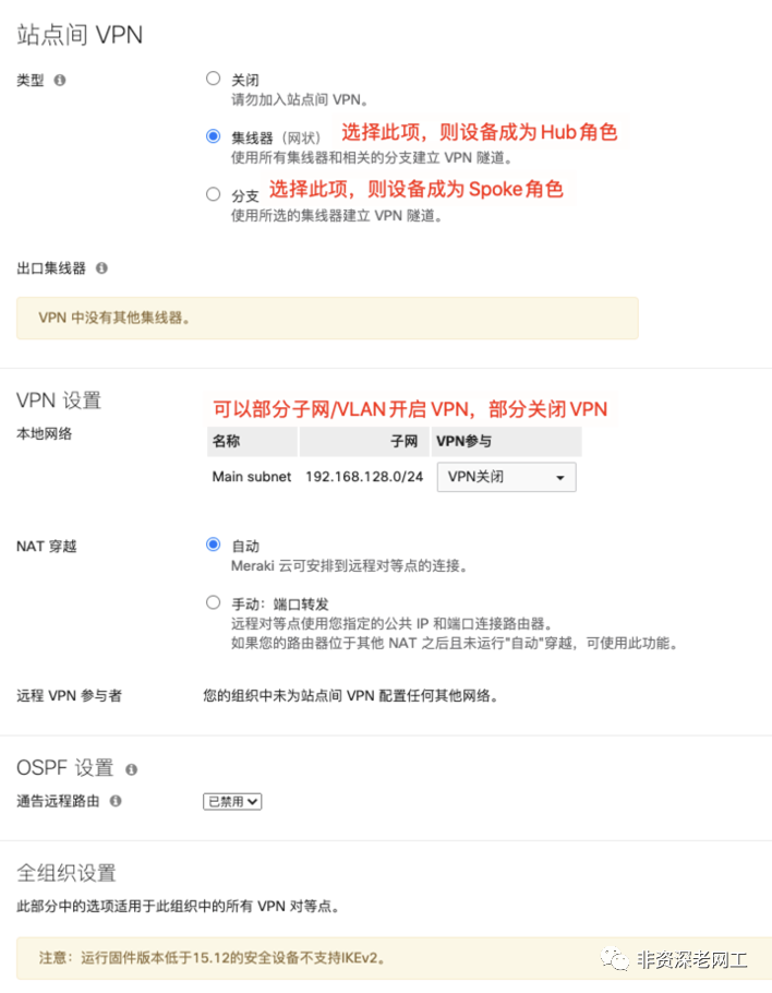 Meraki 网关设备可以一键部署Hub-and-Spoke 模式的Site-to-Site VPN。