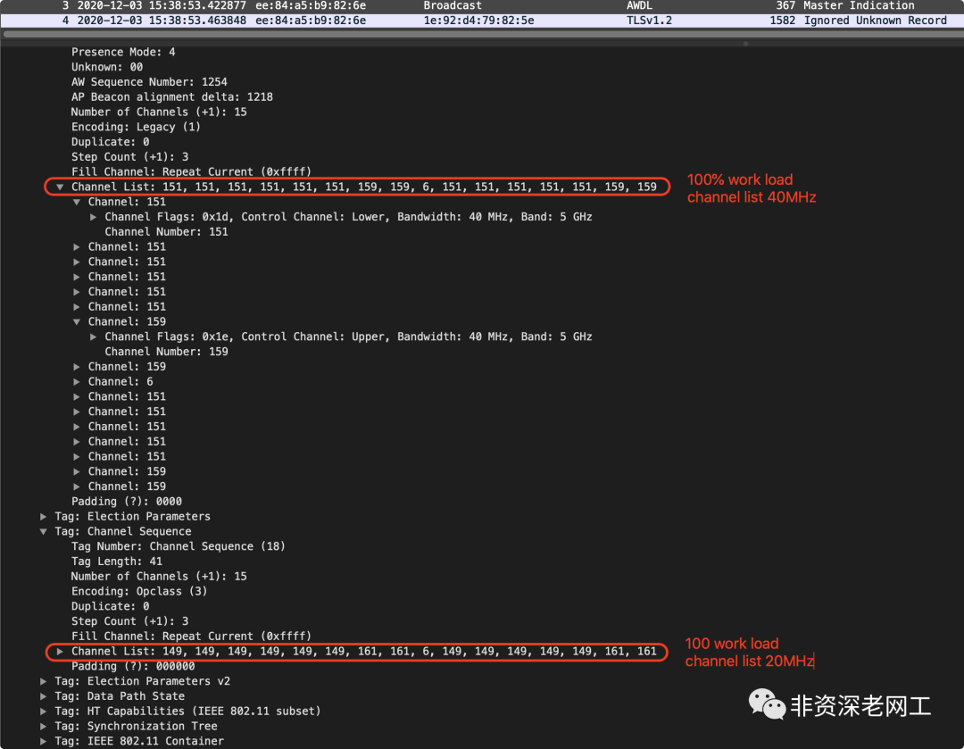 下面的截图是 MIF,因为传输的文件大了一点,所以 work load 100%。在 Synchronization Parameters TLV 里面,Channel List 被充满。除了 ch151 之外,还有 4 个 AW 使用 ch159。都是 40MHz。