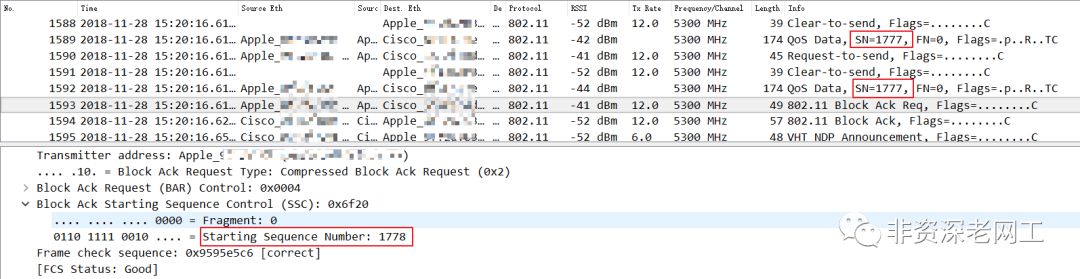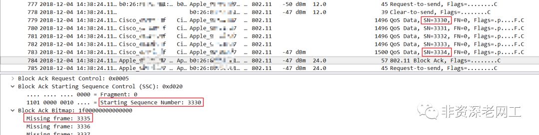 上面是 AP 向 STA 发送 QoS Data frames 的抓包截图。首先,AP 连续发送了多个 Data frame;其次,没有 BA Request;最后,关键的一点,Starting Sequence Number 肯定与 Transmitter 所发送的第 1 个 Data frame SN 相同。在上面的截图中可以看到,AP 本次发送的第 1 个 QoS Data SN=3330,所以 BA Starting SN 也是 3330。