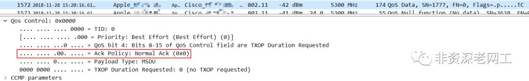 继续观察,发现所有 STA,以及 AP,它们发出来的所有 Data frame 所携带的 QoS Control,都将 ACK Policy 设置成了 Normal ACK: