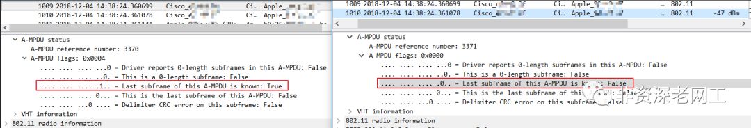 而在前面的那些 Data frame,A-MPDU flags 的值是 0x0004,Last subframe of this A-MPDU is known: True。