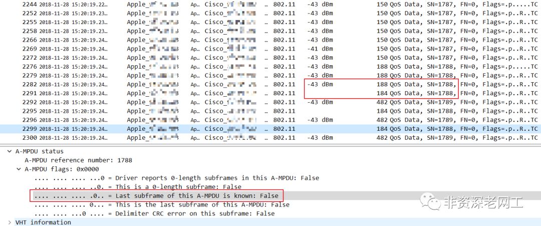 现在我们回过头来再去观察故障 MacBook 所发出的 Data frame。从 MacBook 的行为可以看出来,它在发送 Data frame 之后,它在等待 BA 却没有收到,所以才会重传。使用 wlan.fc.type eq 2 过滤这台 MacBook 的 Data frame,发现几乎所有的 Data frame 都将 A-MPDU flags 设置成了 0x0000 —— 它确实表明了自己是最后一个 Data frame。但换句话说,这台 MacBook 也几乎没有尝试去使用块传输。