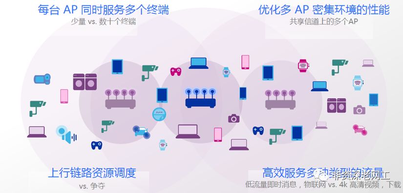 回到正题。OFDMA和MU-MIMO可以互补,根据流量类型自动选择是采用OFDMA还是采用MU-MIMO(它们并不是同时工作的)。对于低带宽的应用,采用OFDMA,可以提高性能和效率,降低延迟。对于高带宽的应用,采用MU-MIMO,可以为每个用户都提供高速连接,提升无线网络的容量。