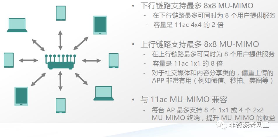 MU-MIMO(Multiple user MIMO)可以把多个空间流分配给多个STA,所以称为多用户MIMO。它从802.11ac Wave2开始得到支持,但只能在下行方向(AP向终端设备发送数据)被支持,在上行方向(终端设备向AP发送数据)仍然是单用户的。而802.11ax在上行方向和下行方向都可以支持MU-MIMO,空间流的数量也从4个增加到8个。